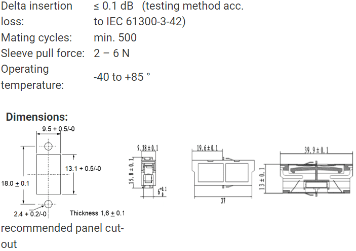 The LSH adapters are designed for connectors with PC and APC polish processes. The integrated protective cap of the LSH protects the ferrule from dust and prevents any laser light emission; the single type is equipped with a metal inner flap. The LSH adapter is compatible with E2000™ connectors. LSH adapters are available with or without flanges. The dimensions of the single adapter are the same as those of the SC type, allowing standardized cutouts to be used for all adapters that are compatible with the SC standard.