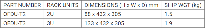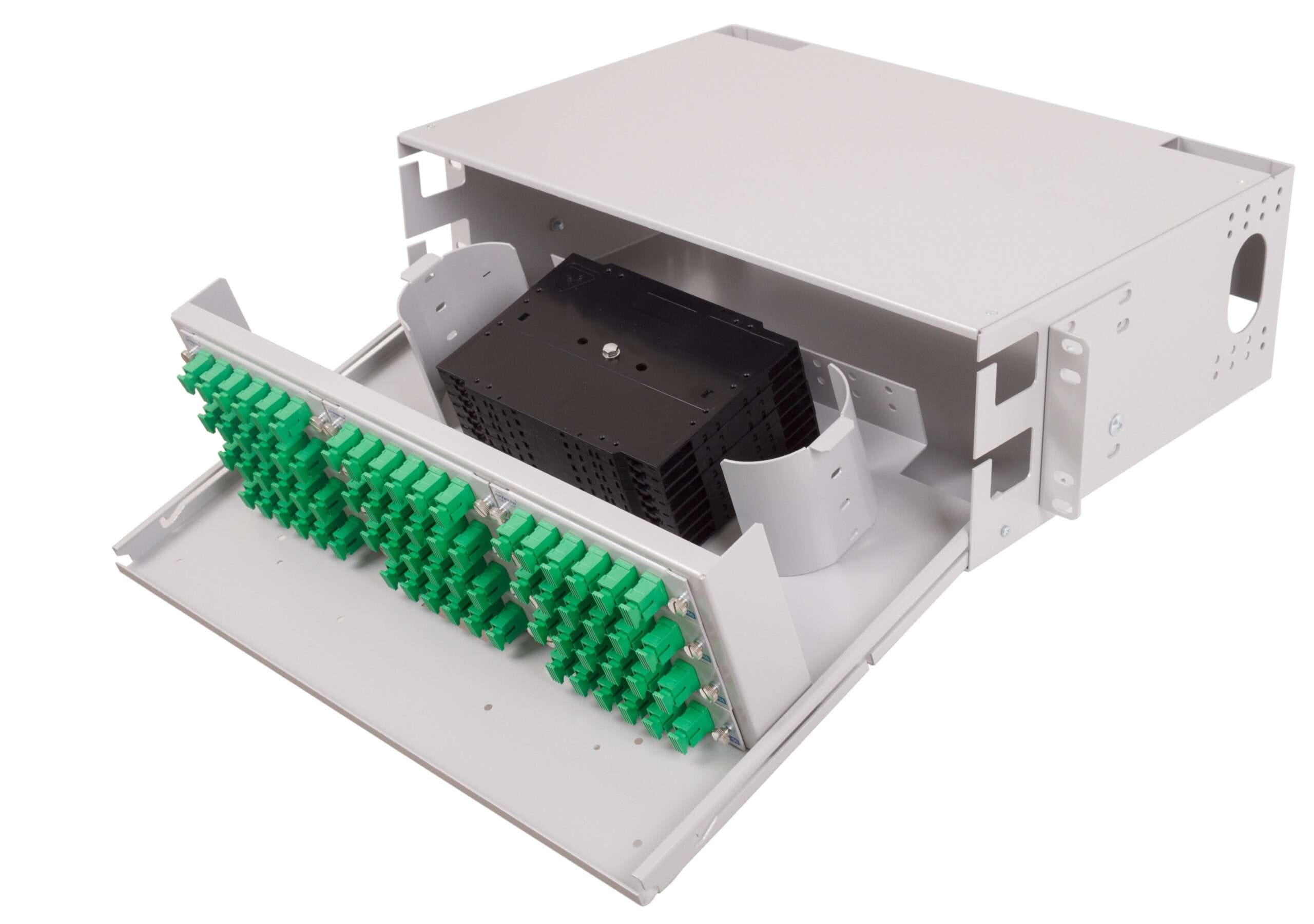 The OFDU-T cabinet is based on universal optical distribution frames. The uniform modular system allows for easy reconfiguration and can be expanded according to the operator’s needs. The OFDU-T provides termination in a convenient housing unit. It terminates up to 144 fibers in a 3U distribution frame and can accommodate up to 12 snap-in coupling fields or pre-wired cassettes. The extendable and foldable shelf allows unrestricted access to termination fields and cable slack from the front, back, and top.