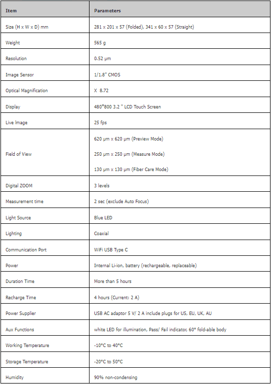 All-in-One Design Based on an embedded Linux system, the AutoGet WiFi probe features an integrated 3.2-inch high-density LCD. AutoGet WiFi can perform individual inspections and analyses without the need for connections to other devices. Foldable and Flexible With its unique rotational axis structure, AutoGet WiFi can be used in a straight or folded position, allowing measurements in different heights or conditions. One-Hand Operation The integrated 3.2-inch LCD touchscreen enables simple and effective interaction. One-hand operation is facilitated by two buttons that cover most adjustment functions. One-Click Measurement Simply press the trigger button, and AutoGet WiFi will automatically perform the entire measurement. The dimension software detects the DUT (Device Under Test), automatically centers and focuses. The fiber end face is accurately analyzed according to IEC or a custom standard, and the test results are saved for future reference. Wireless Data Transmission Through a wireless connection, AutoGet WiFi can transmit real-time images, mass data, and individual reports to smart devices on iOS, Android, or Windows platforms. USB cable mode is also supported. Test results can be stored on an embedded micro SD card.