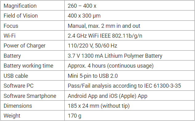 The fiber optic end face inspector is designed for examining ferrule end faces with outstanding performance and user-friendly operation. It magnifies the object by 260 to 400 times, making it easier to assess the condition of the fiber optic end face. Its compact size makes it an ideal tool for inspecting connector end faces before and during the installation of fiber optic networks. Various adapter types can be used for testing male and female fiber optic connectors such as FC, SC, ST, and LC. The OPTOKON FOI-400W microscope can connect via USB and Wi-Fi to PCs and smartphones/tablets, compatible with both Android and Apple operating systems. The software allows for the storage of tested connectors for later evaluations and reporting, as well as PASS/FAIL analyses in accordance with the IEC 61300-3-35 standard. The OPTOKON FOI-400W microscope operates for 4 hours on a rechargeable 3.7V lithium polymer battery.