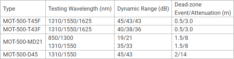 The Optical Time Domain Reflectometer (OTDR) of the MOT-500 series is a next-generation intelligent measuring device designed for fiber optic communication systems. As optical networks become more prevalent in urban and rural areas, the measurement of optical networks becomes shorter and more distributed; the MOT-500 is specifically developed for these types of applications. It is cost-effective and offers outstanding performance. The MOT-500 is manufactured with patience and care, meeting national standards to combine extensive experience and modern technology. It undergoes rigorous mechanical, electronic, and optical testing and quality assurance. Additionally, the new design makes the MOT-500 smarter, more compact, and versatile. Whether you need to detect the connection layer when building and installing optical networks or carry out efficient maintenance and troubleshooting, the MOT-500 can be your best assistant.