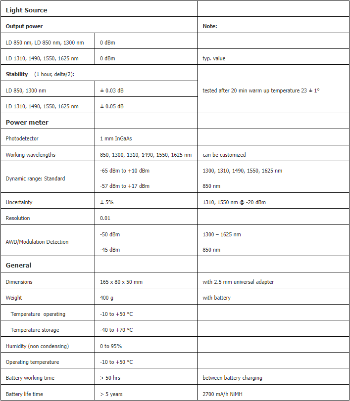 The optical attenuation test set of the OFT-820 series combines two optical testing devices—light source and power meter—into a single unit. The optical light source meets all necessary technical requirements for field equipment and is available in various operational wavelength combinations: 850, 1300, 1310, 1490, 1550, and 1625 nm. The optical power meter is designed for measuring absolute or relative optical power in optical networks. The memory capacity allows for the storage and uploading of up to 3000 measurements, including memory position or fiber number, wavelength, absolute or relative value, and insertion loss. The PC evaluation software SmartProtocol supports memory downloads, report generation, and data export for downloading data into an Excel spreadsheet. The rechargeable battery ensures long-term operation with a minimum lifespan of 5 years.