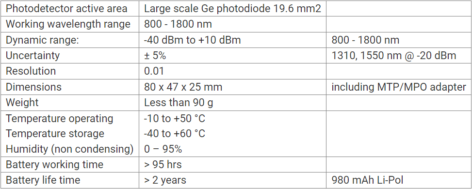 The optical power meter PM-212-MTP-GE is designed for measuring absolute or relative optical power in optical networks with multifiber MTP/MPO connectors. By using the large-area Ge photodiode, the tester can measure the total optical power level of all fibers from MTP/MPO connectors across a wide wavelength range. There are two versions for simultaneous measurements: 12/24 multifiber MPO/MTP connectors 16/32 multifiber MPO/MTP connectors The memory capacity allows for storing and uploading up to 100 measurements, including storage position or fiber number, wavelength, absolute or relative value, and insertion loss. The PC evaluation software SmartProtocol supports memory downloads, report generation, and data export for downloading data into an Excel spreadsheet. The rechargeable battery ensures long-term operation with a minimum lifespan of 2 years. The batteries can be charged via a USB port or an external AC/DC adapter. The controlled charging process ensures optimal battery status and extended operating time.