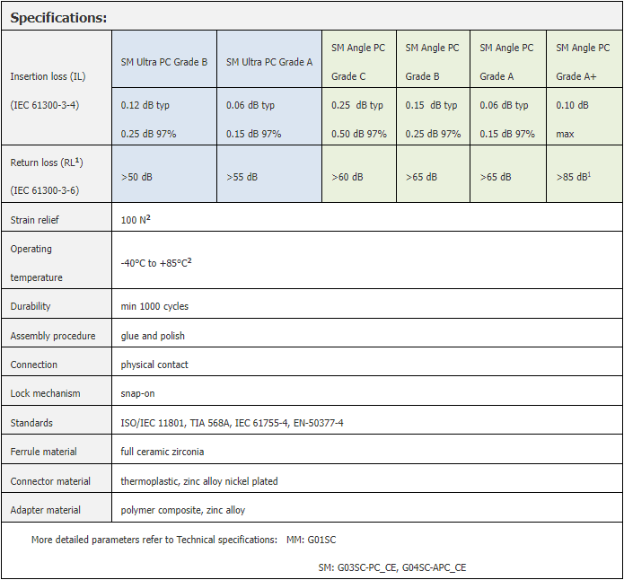 OPTOKON SC patch cords are manufactured in accordance with JIS, IEC, EIA/TIA, and ANSI specifications for connectivity and optical performance. The SC patch cords are offered for SM applications and are available with PC and APC polishing options. All OPTOKON connectors are now laser-marked with the OPTOKON logo, and the patch cords are produced by the OPTOKON Cable Factory. They feature a Low Smoke Zero Halogen (LSZH) cable jacket, a 0.9 mm Easy Strip buffer type, and bend-insensitive ITU-T G.657.A2 fiber.