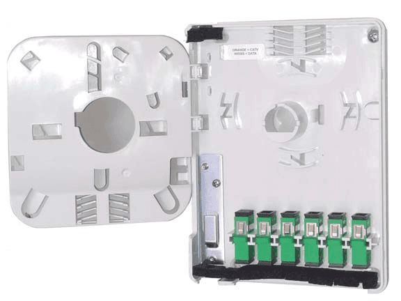 The wall box GPX51 type GA2 is used both as an APL and as a MTP and offers space for 6 SC or LC-DX adapters. Compact splitters and filters (Small Tubes) can also be housed. Opposing entries allow for the pass-through or connection of fiber optic cables. The entries are also suitable for receiving a microduct with a gas blocker termination. The splice tray significantly facilitates fiber management and ensures seamless directional reversal. The optional housing lock protects against unauthorized access.