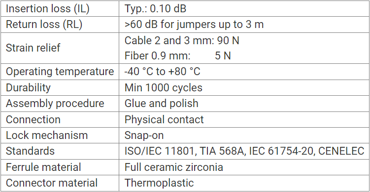 Der LC-Stecker wird hergestellt, um die Spezifikationen EIA/TIA 568A, FOCIS 10, IEC 61754-20 und CENELEC für optische Leistung und Kompatibilität zu erfüllen. Der LC Duplex passt in den Standardausschnitt des SC-Einzeladapters und verwendet den Kabelmantel mit dem kleinsten Durchmesser der Branche.