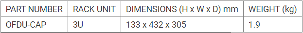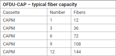 Der OFDU-CAP-Schrank ist in erster Linie für die bequeme Platzierung von CAPM-Kassetten vorgesehen. Das einheitliche modulare System ermöglicht eine einfache Lagerung und Befestigung von CAPM-Kassetten und kann je nach Bedarf des Betreibers erweitert werden. Der OFDU-CAP terminiert bis zu 144 Fasern in einem 3U-Verteilerrahmen. Diese Einheit kann bis zu 12 vorverdrahtete CAPM-Kassetten aufnehmen.