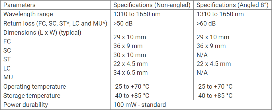 Die optischen Steckeranschlüsse werden zum Anschluss von Dark Fiber-Ports an Glasfaserkomponenten verwendet. Die Zirkonia-Ferrule ist poliert und hat eine abgewinkelte oder nicht abgewinkelte Endfläche, um unerwünschte Reflexionen von offenen Ports zu reduzieren. Diese Anschlüsse bieten im Vergleich zu anderen Anschlussmethoden auch eine verbesserte Sicherheit für das Personal.