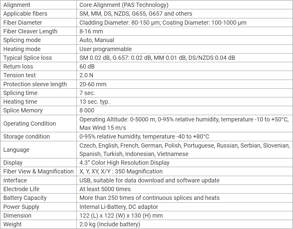 - Weltweit schnellste Spleiß- und Aufheizzeit: 7 Sekunden Spleißen und 13 Sekunden Aufheizen