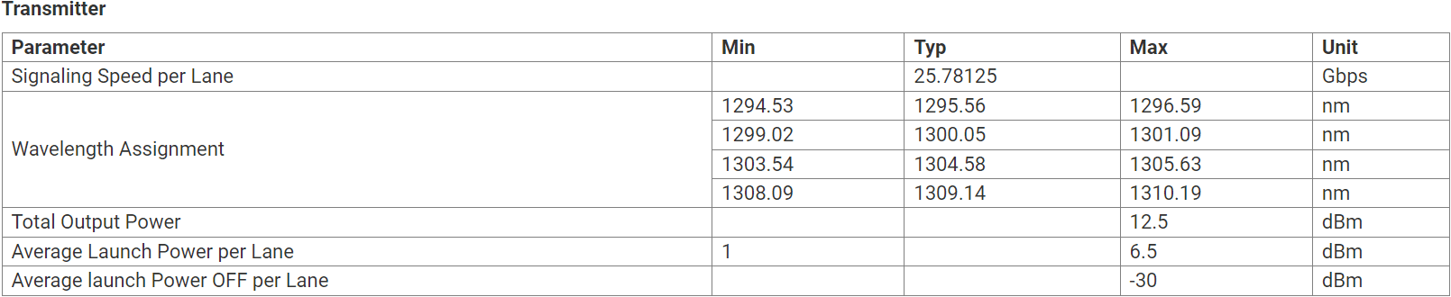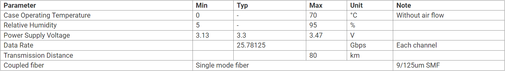 Auf der Sendeseite werden vier Spuren serieller Datenströme wiederhergestellt, neu getaktet und an vier Lasertreiber verteilt. Diese Treiber steuern 4-EML-Laser mit Mittenwellenlängen von 1296 nm, 1300 nm, 1305 nm und 1309 nm. Die resultierenden optischen Signale werden dann kombiniert und über einen Standard-LC-Anschluss über Singlemode-Glasfaser übertragen. Für den Empfang werden die vier Spuren optischer Datenströme mithilfe des integrierten Demultiplexers optisch getrennt. Jeder Strom wird dann von einem SOA+PIN und einem Transimpedanzverstärker verarbeitet, gefolgt von einer Neutaktung. Dieses Modul verfügt insbesondere über eine Hot-Plug-fähige elektrische Schnittstelle, minimalen Stromverbrauch und eine 2-adrige serielle Schnittstelle.